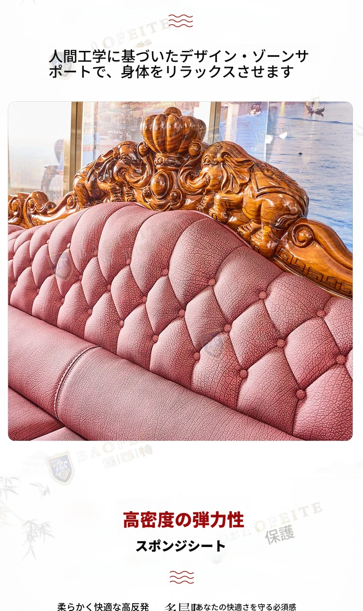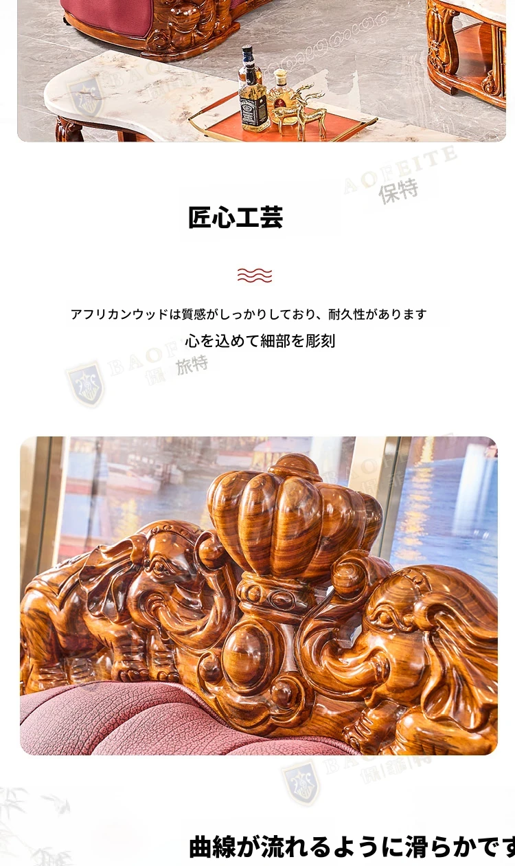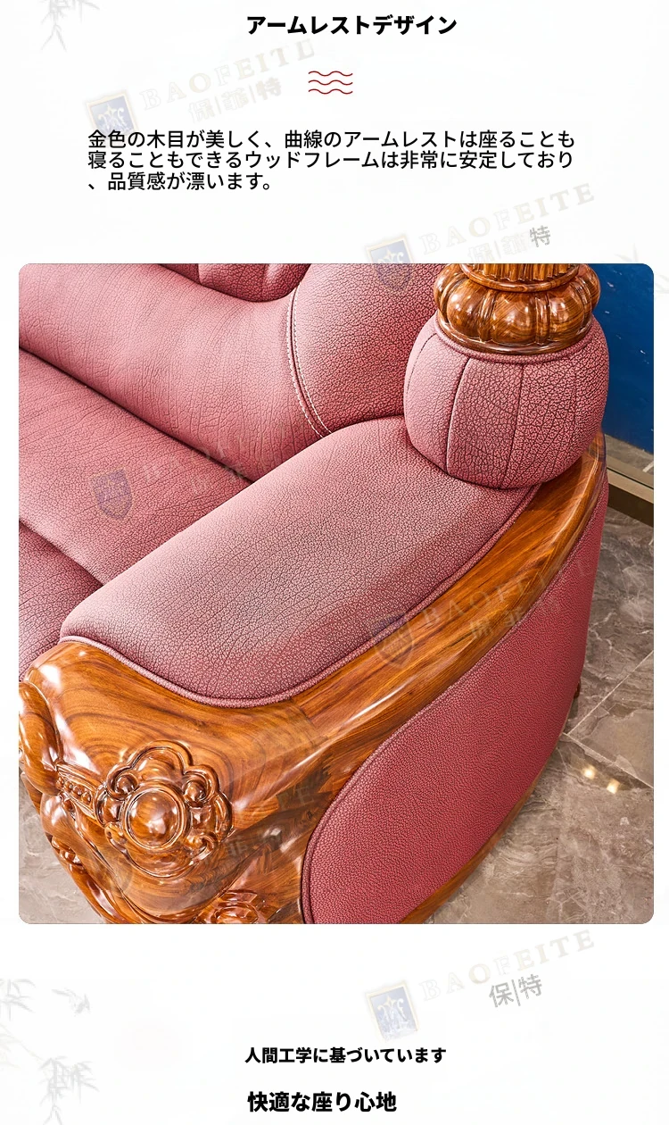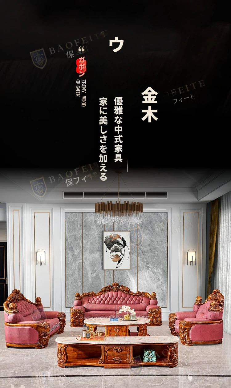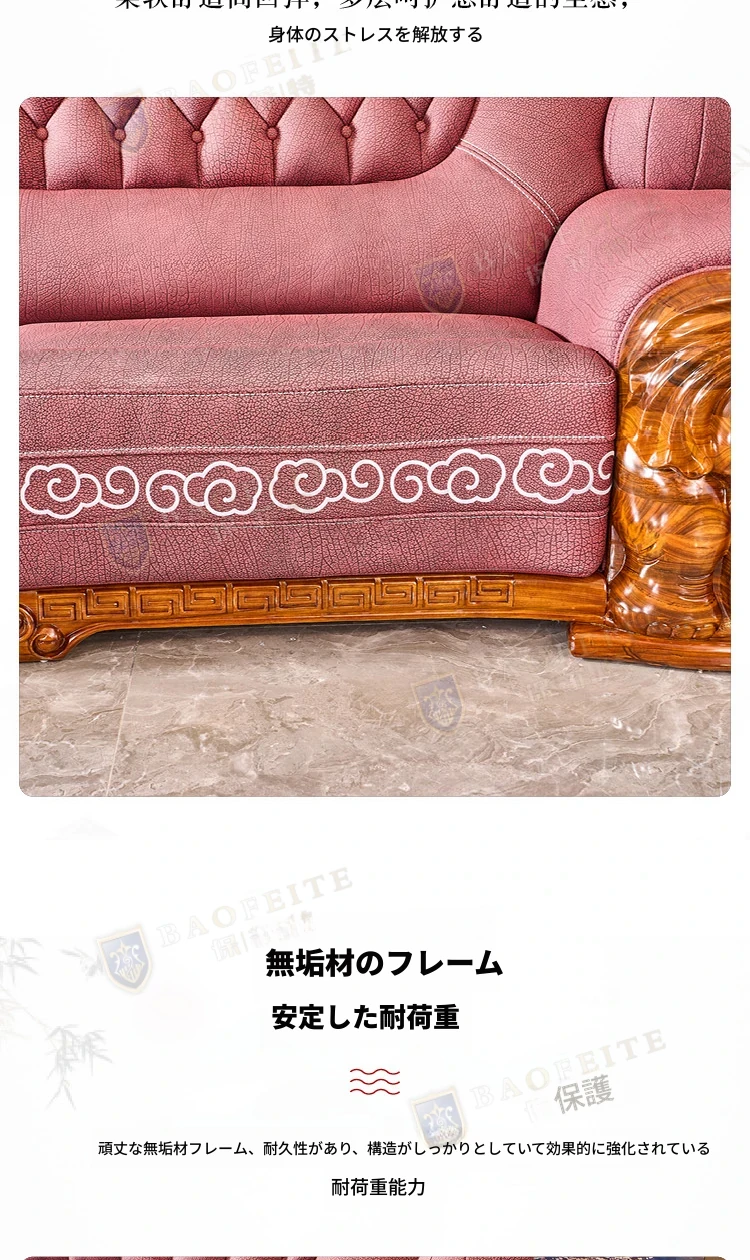 豪華な欧州風ウッドカーペット付きのウッディブラックソファセット - 高級本革製、広々としたリビングルームに最適な自宅用別荘スタイルの家具!
