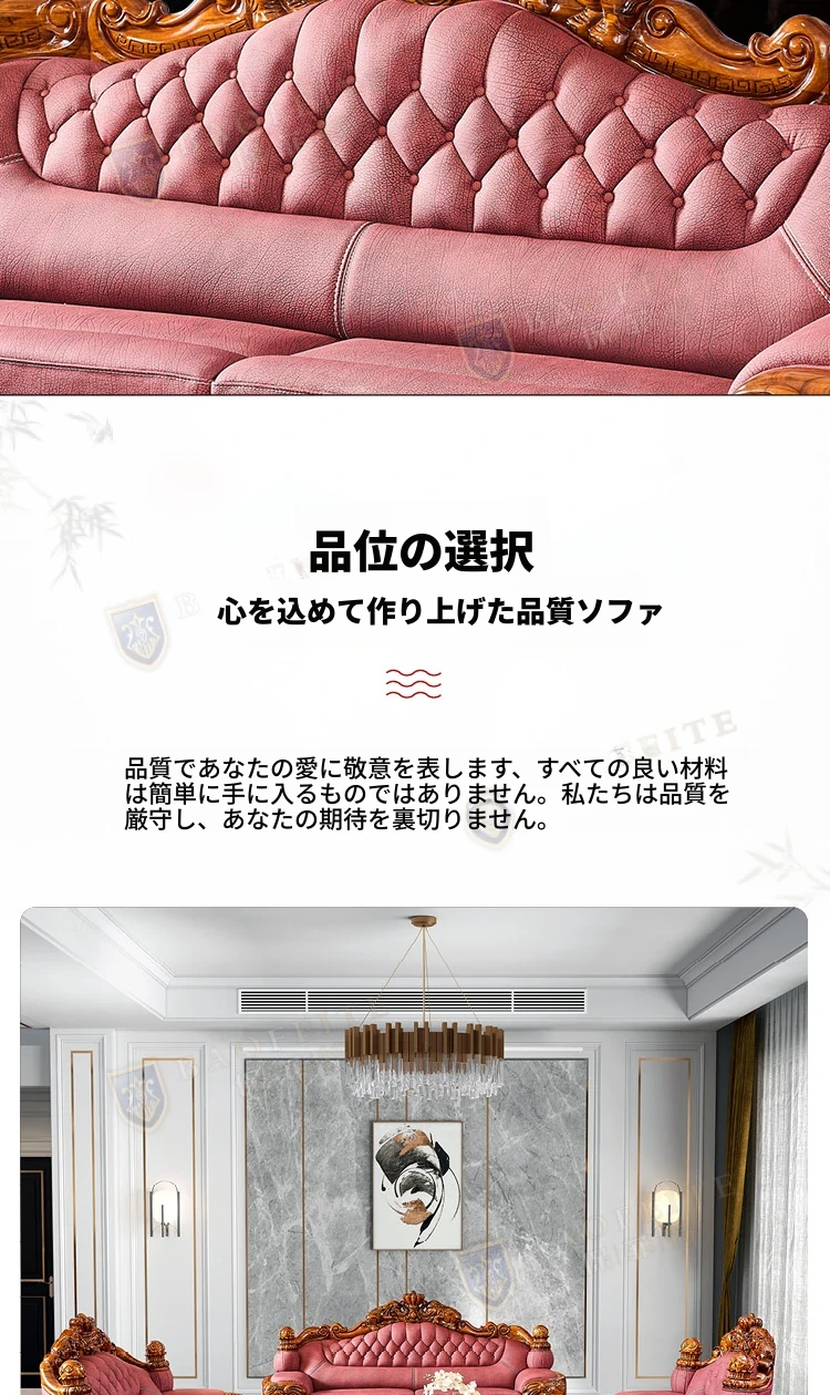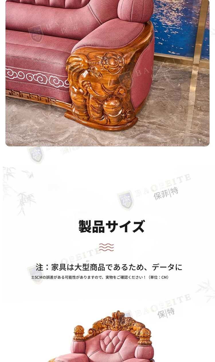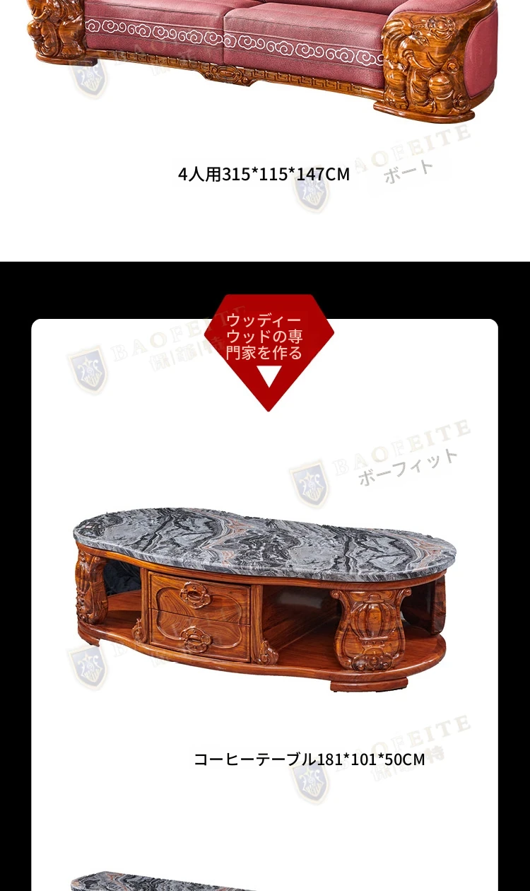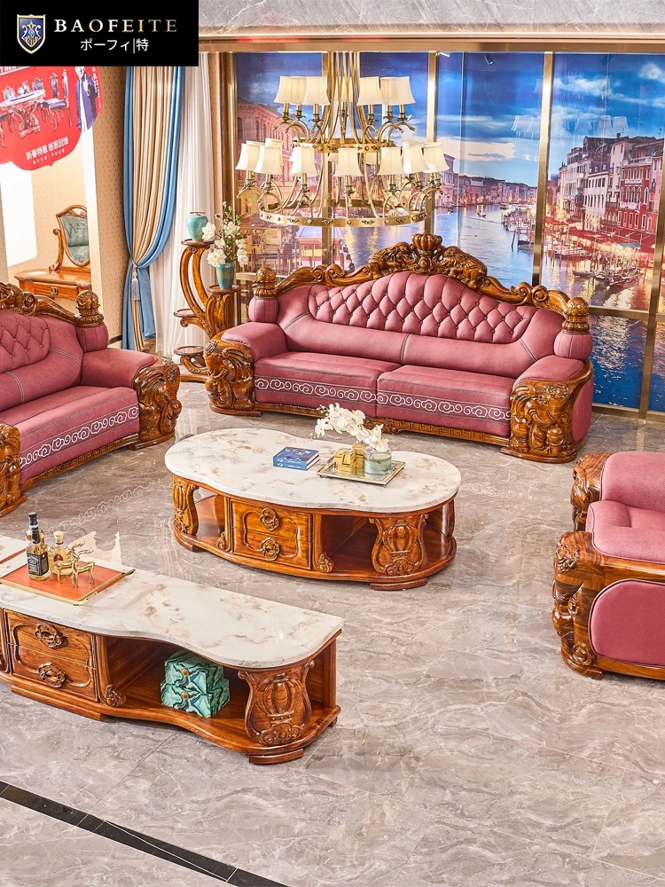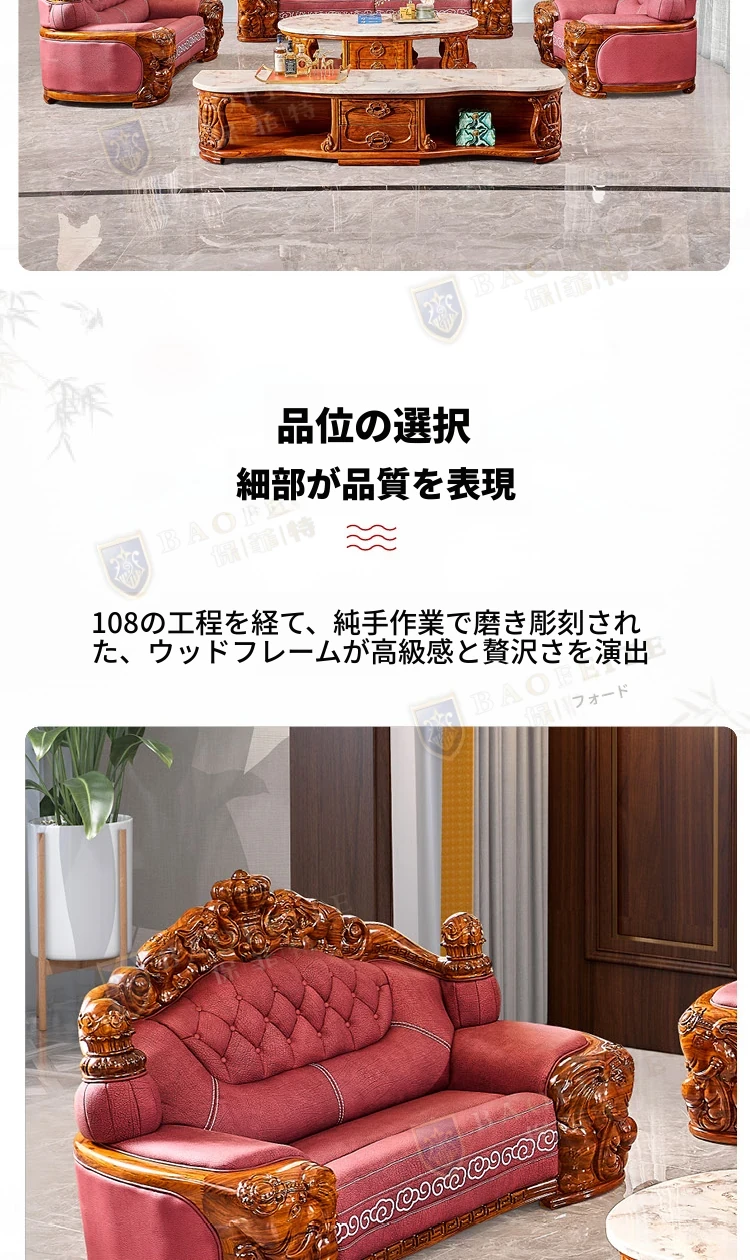 豪華な欧州風ウッドカーペット付きのウッディブラックソファセット - 高級本革製、広々としたリビングルームに最適な自宅用別荘スタイルの家具!