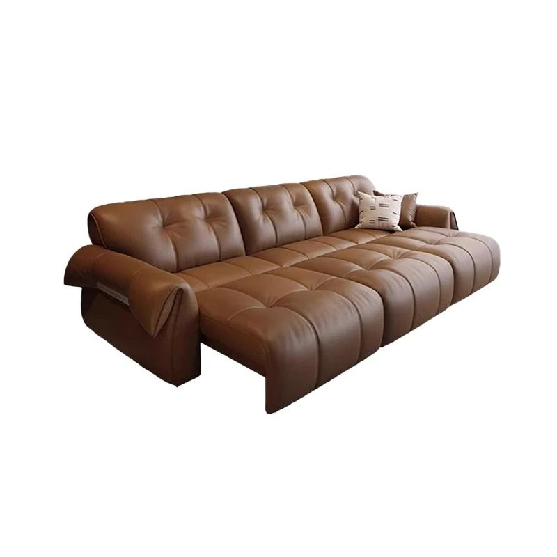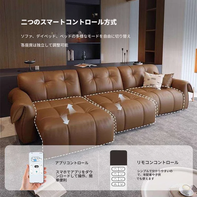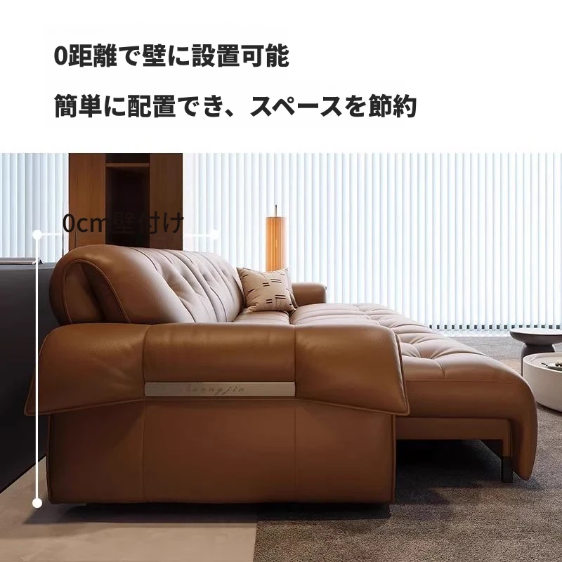 リビングに最適!機能的で伸縮可能なミニマルデザインの電動ソファベッド。高品質の本革を使用した現代的かつシンプルなスタイル、壁にぴったりフィットする古風な魅力を持つソファです。