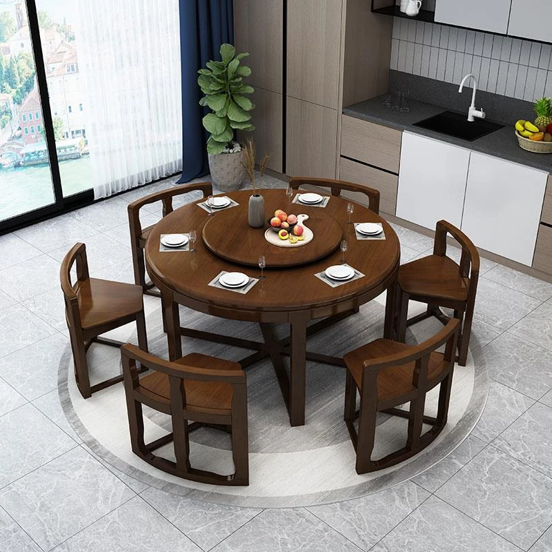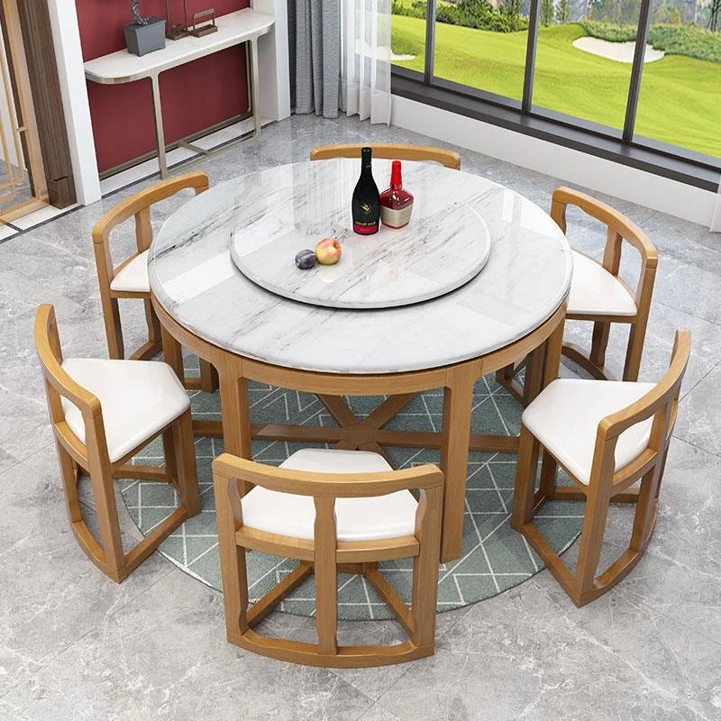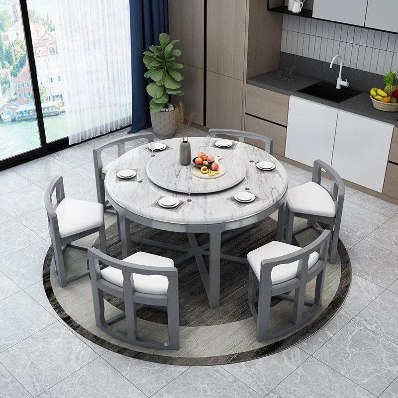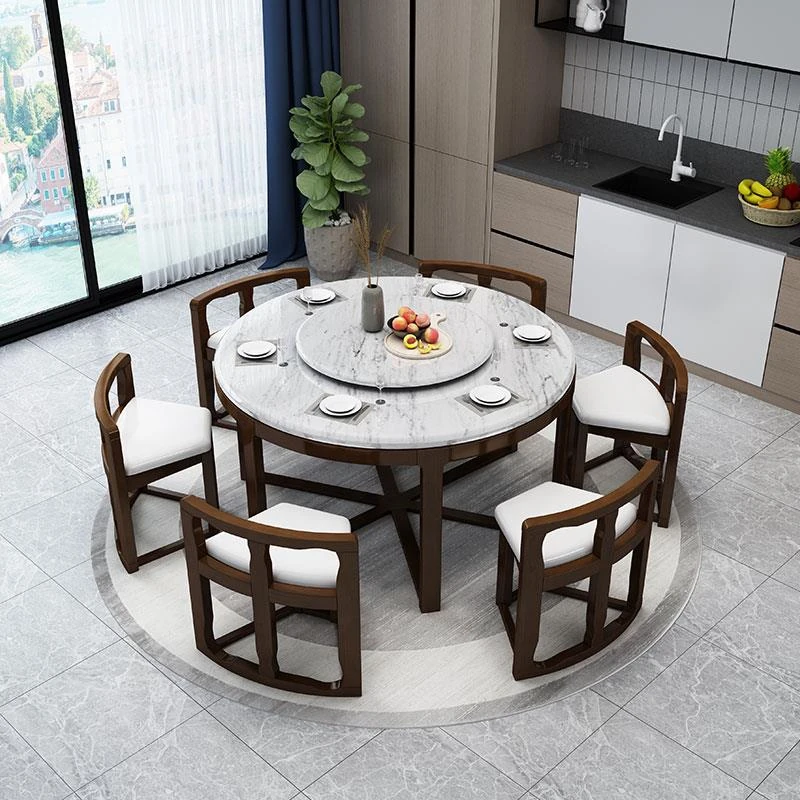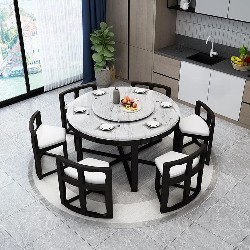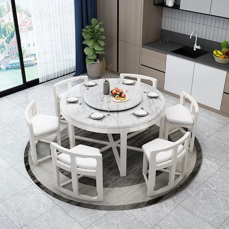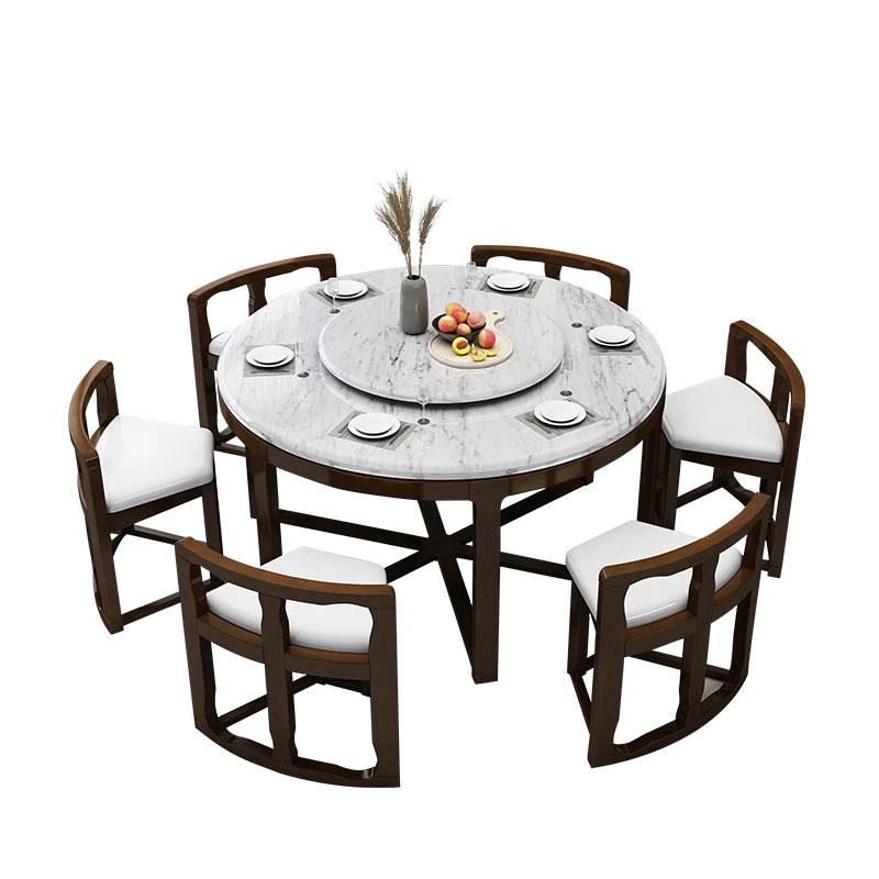 全実木製ダイニングテーブルセット|現代的なシンプルデザイン|小型住宅に最適|隠れた円形デザイン|回転式電磁炉付き|大理石仕上げで高級感アップ!