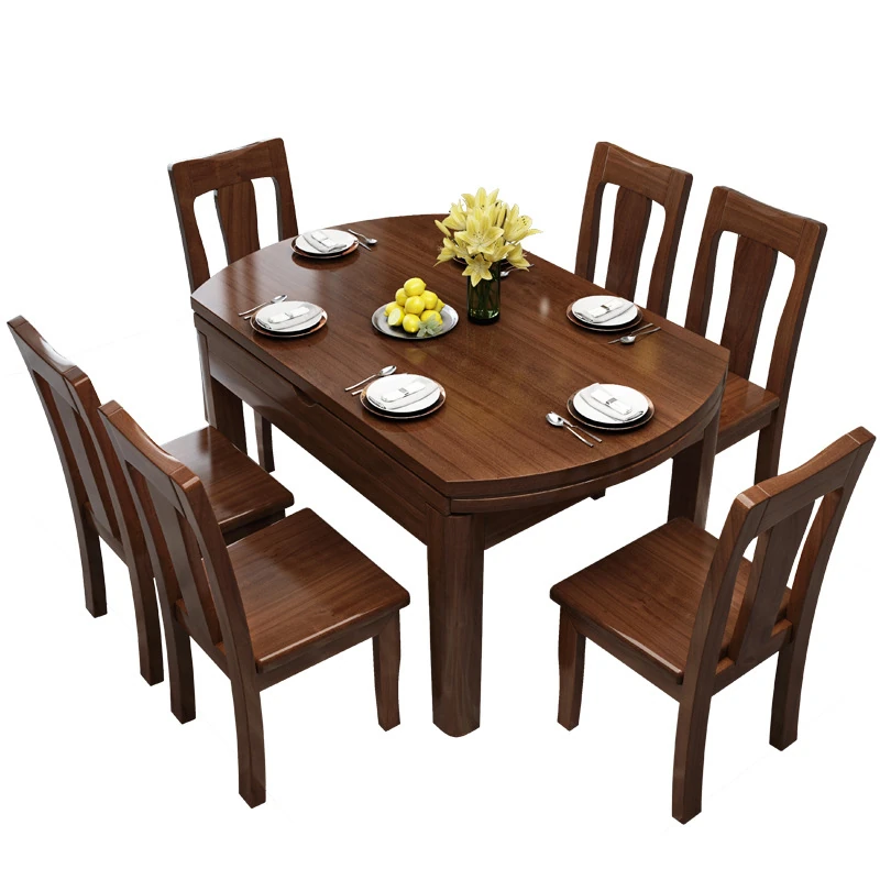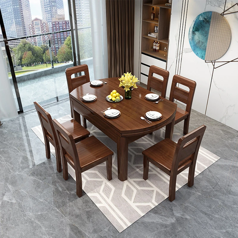 ウォールナット色、1テーブル+6本の無垢材椅子