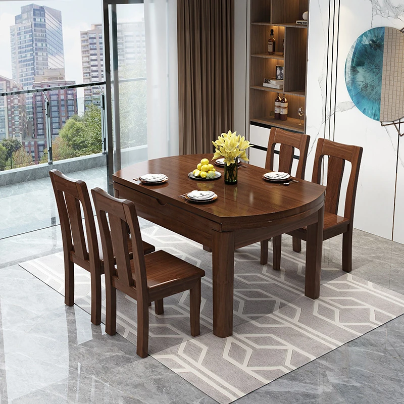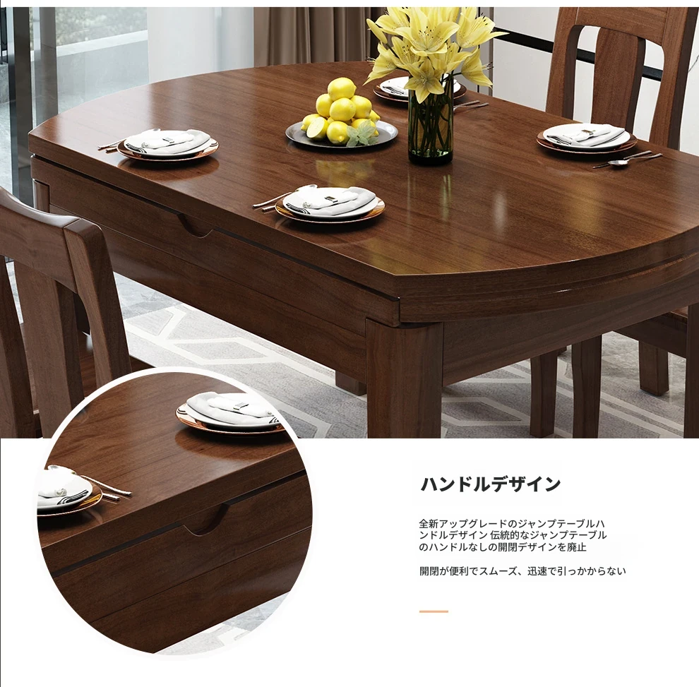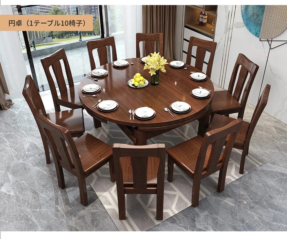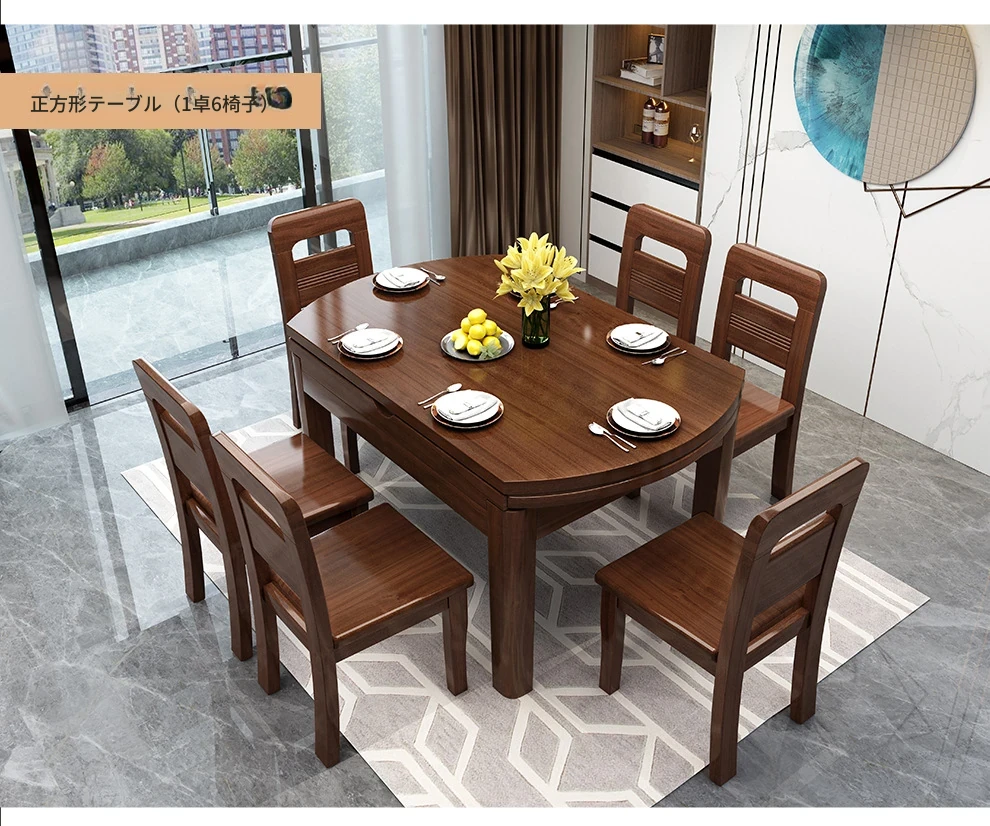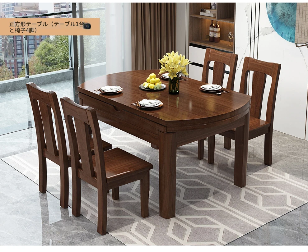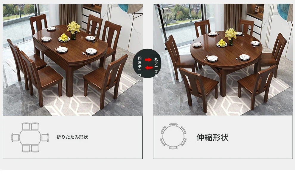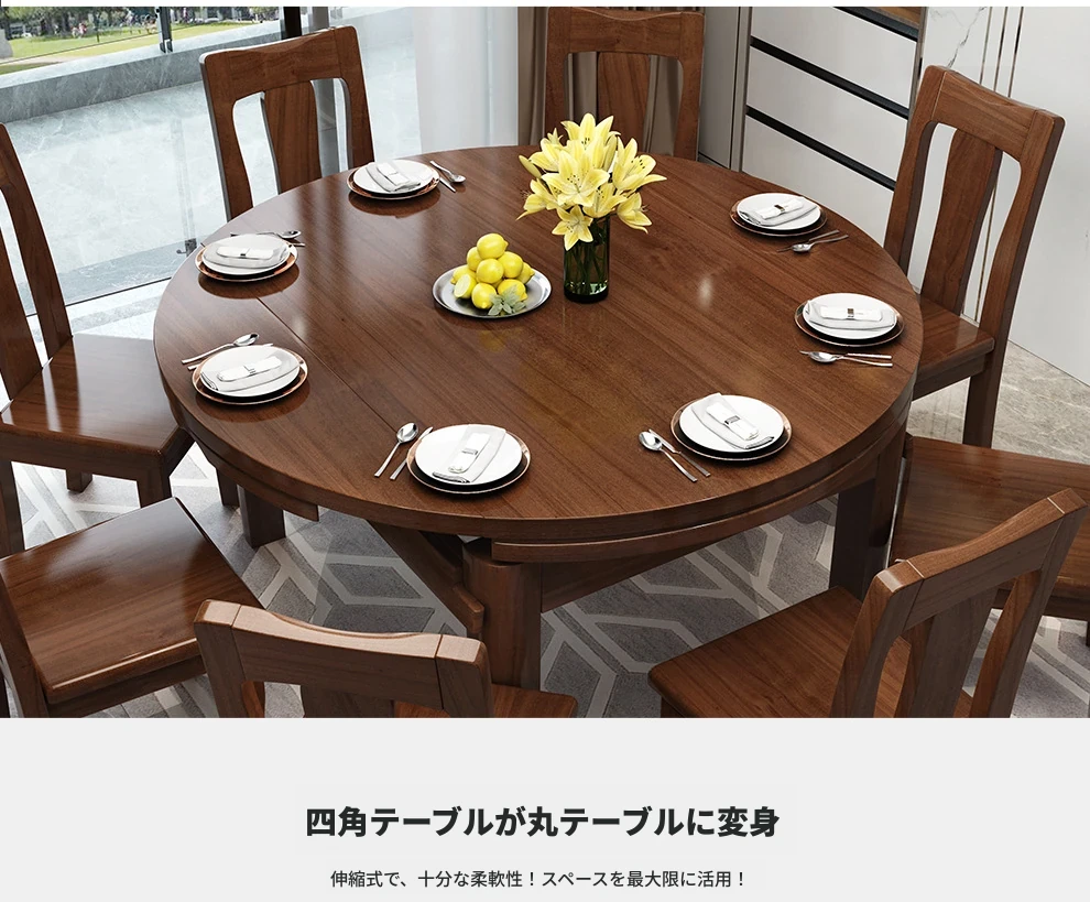 多機能!丸型&角型対応の無垢材ダイニングテーブルセット - モダンでシンプルなデザイン、小スペースに最適なウォールナット製、伸縮&折りたたみ可能なダイニングテーブル!