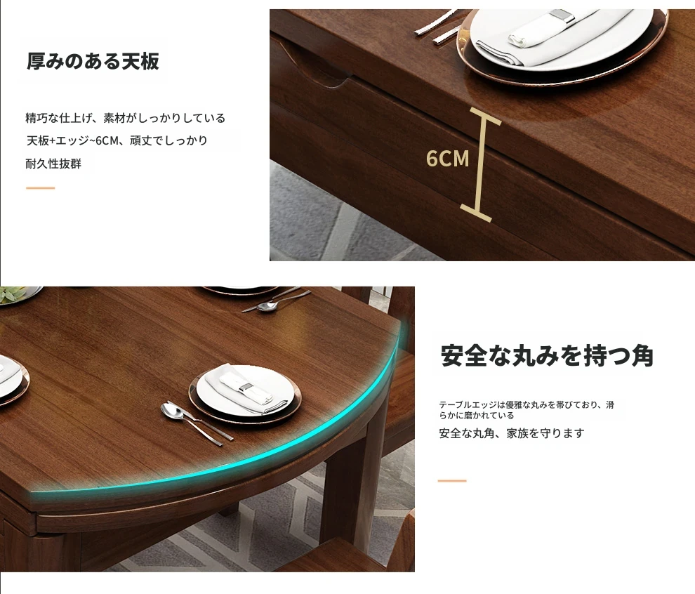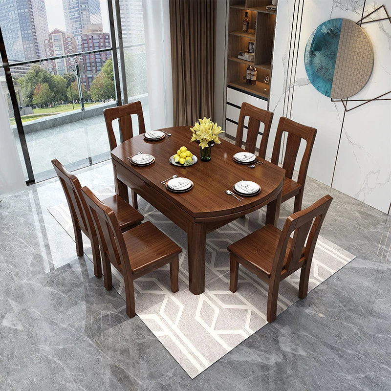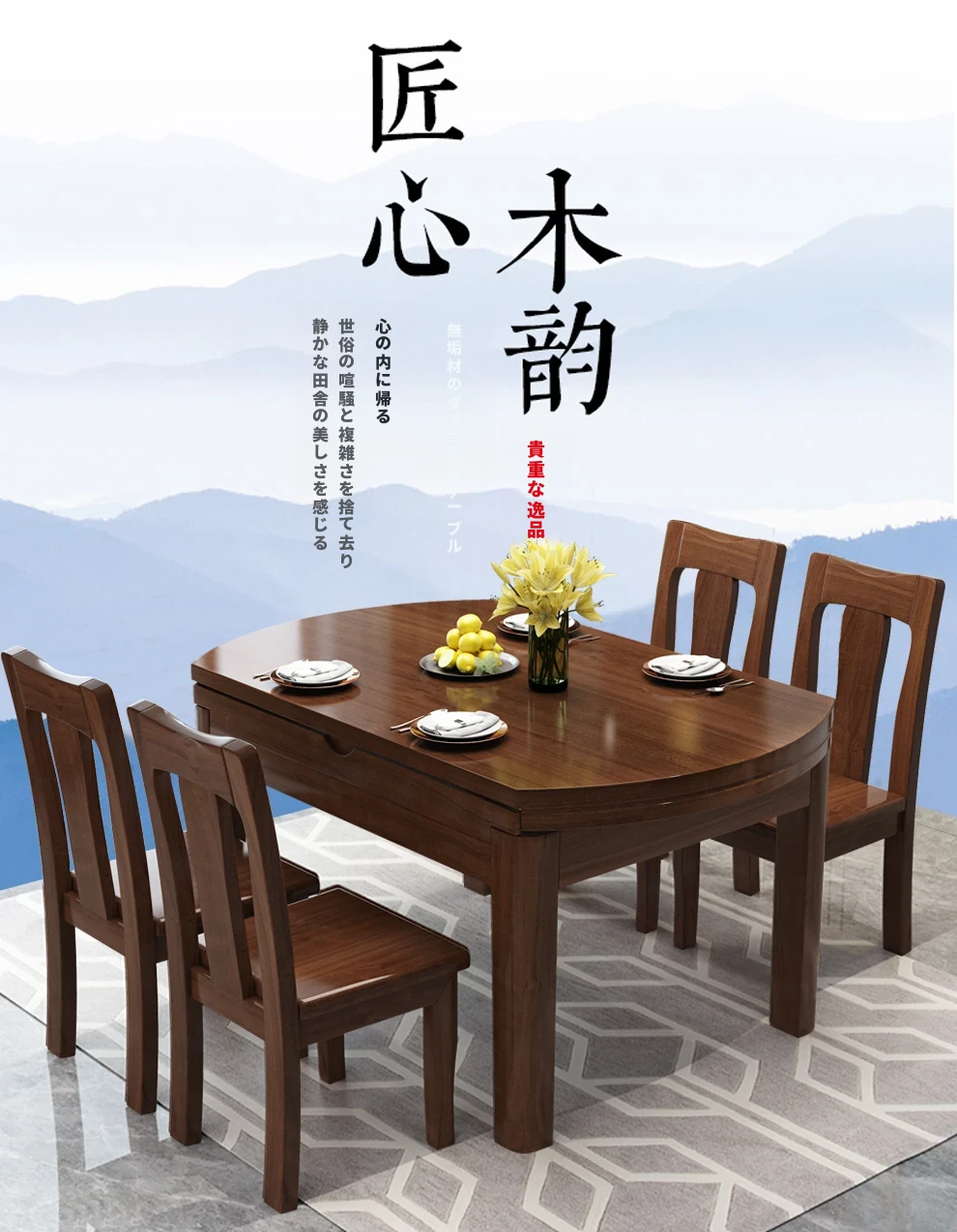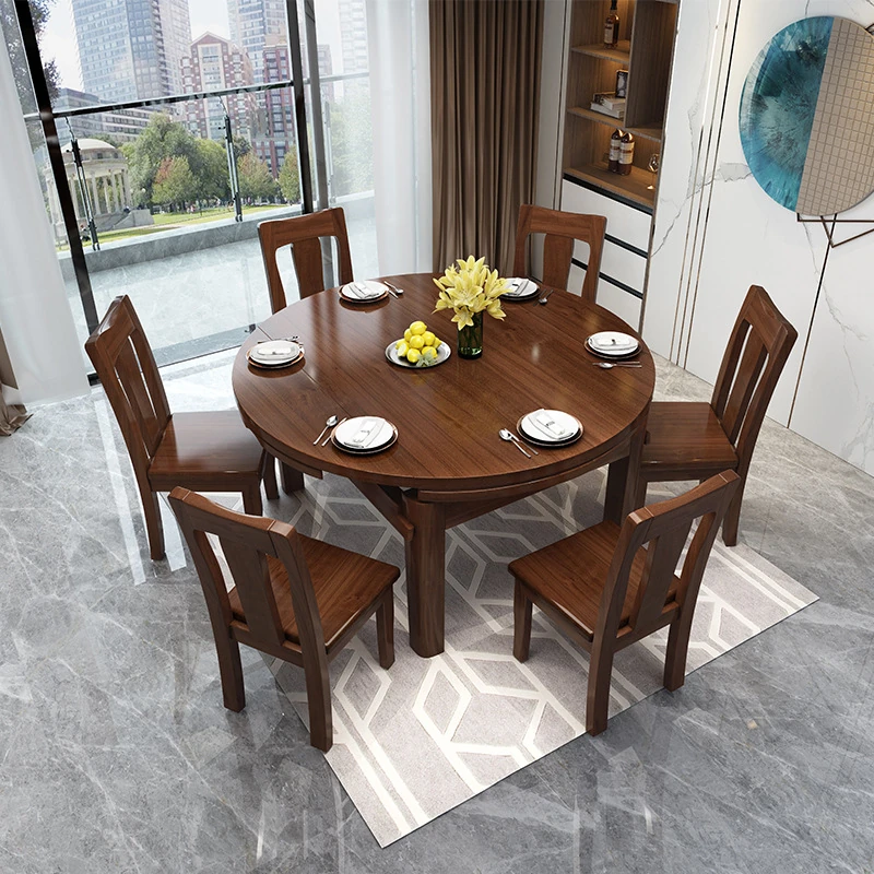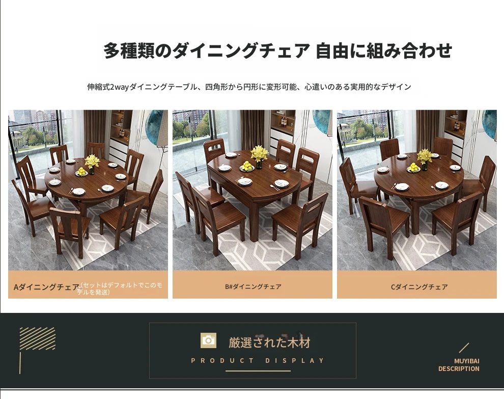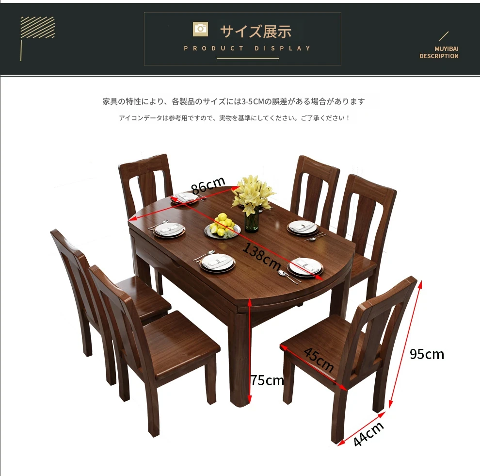多機能!丸型&角型対応の無垢材ダイニングテーブルセット - モダンでシンプルなデザイン、小スペースに最適なウォールナット製、伸縮&折りたたみ可能なダイニングテーブル!