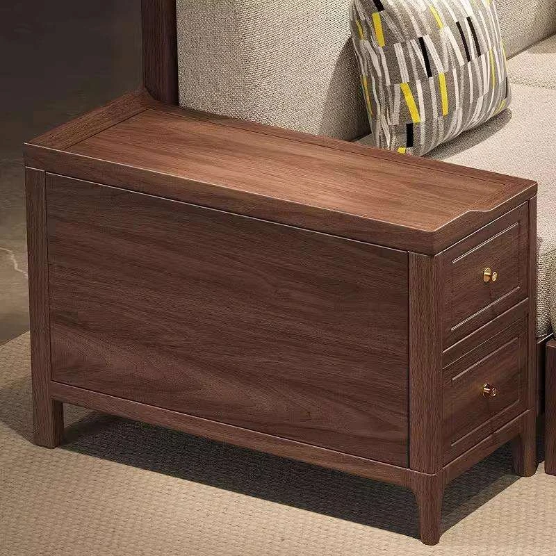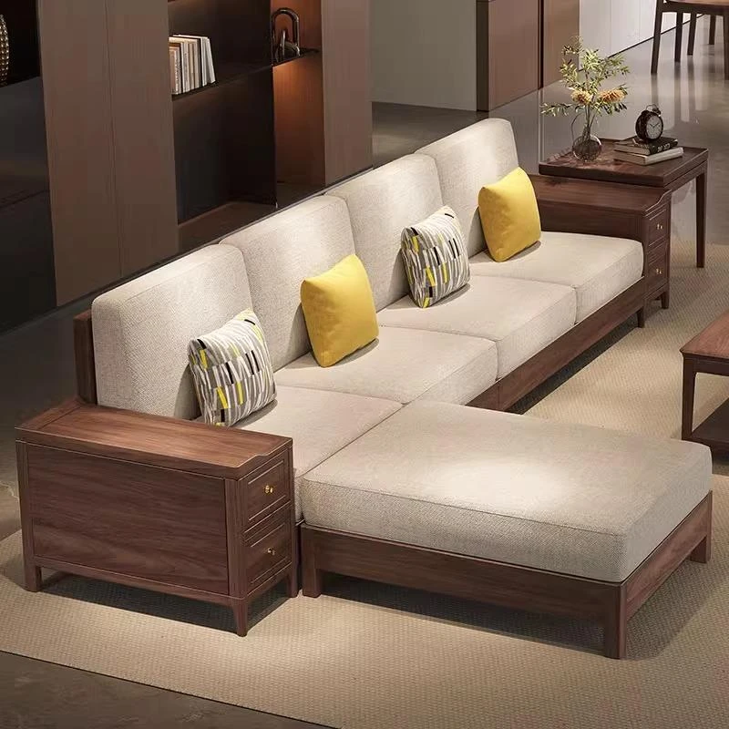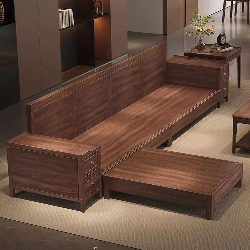 新中式スタイルのブラックウォールナット無垢材ソファセット - 冬夏兼用、収納機能付き、家族向けのコンパクトなリビング家具。快適なひとときを演出します!