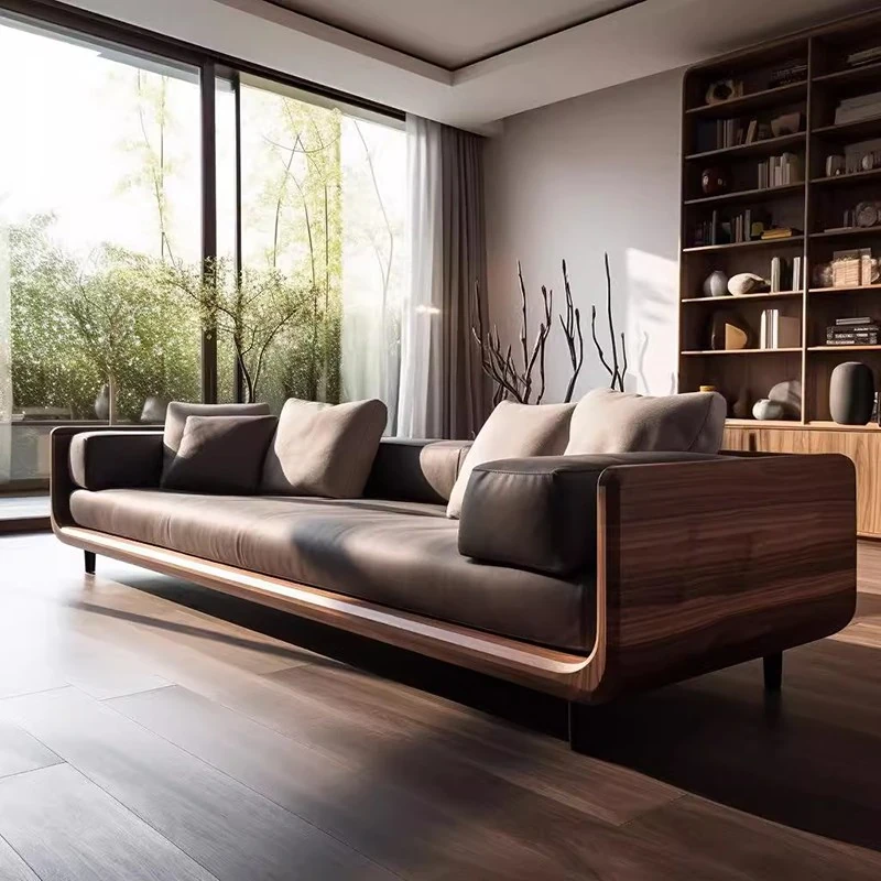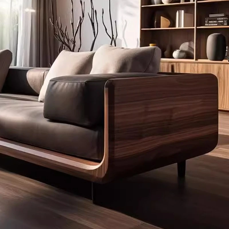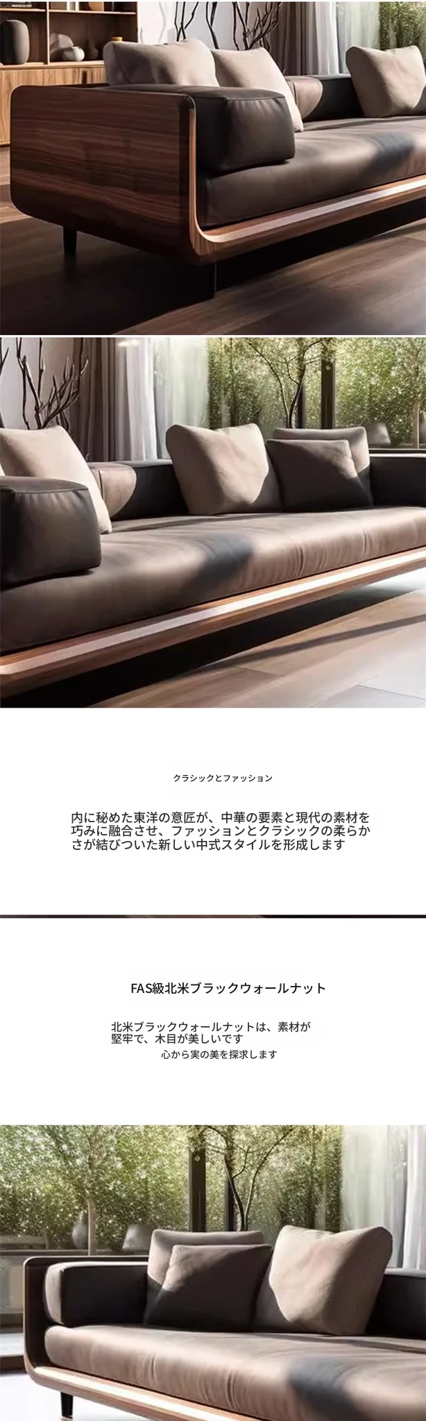 新中式スタイルのウォールナット無垢材ソファ、洗練されたデザインで小型リビングに最適!3人掛けの直線形ソファ、2025年新作で高級感あふれる空間を演出します。