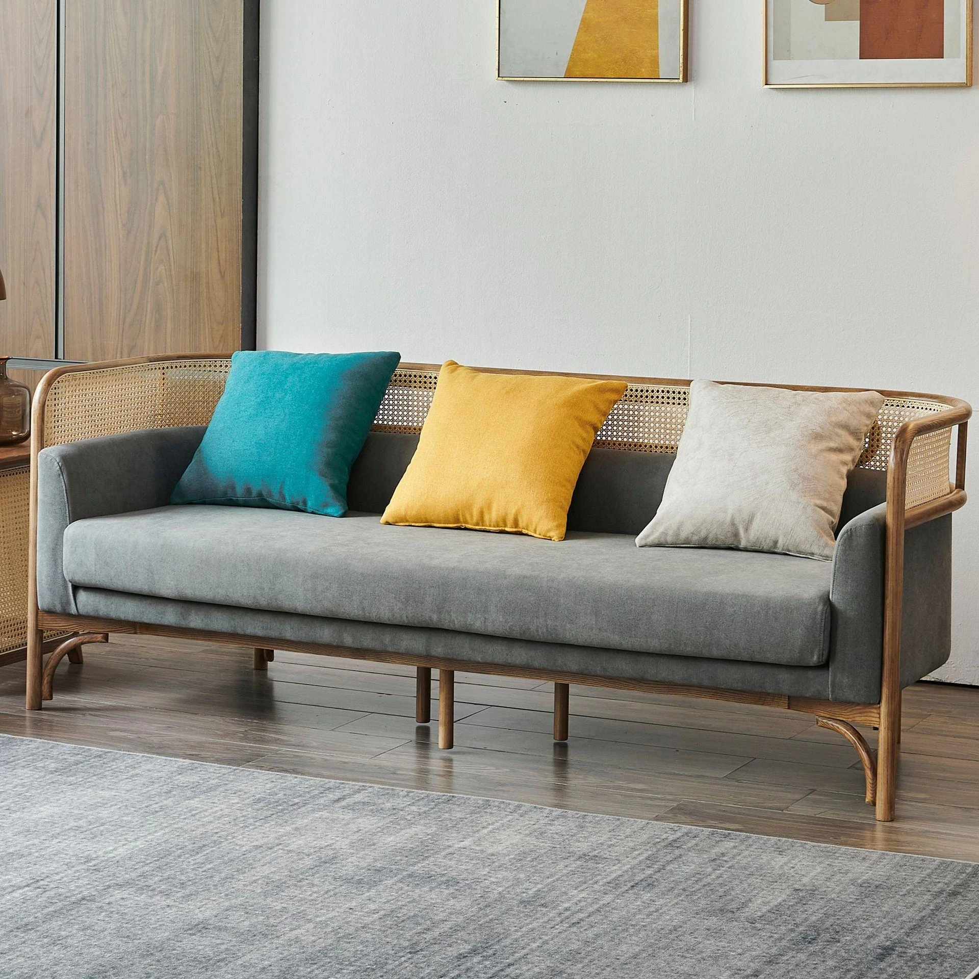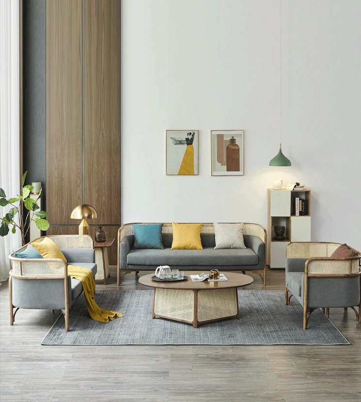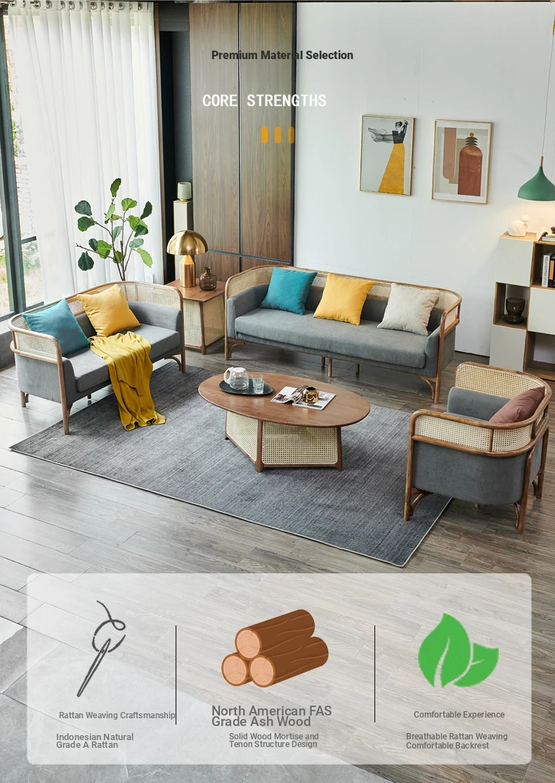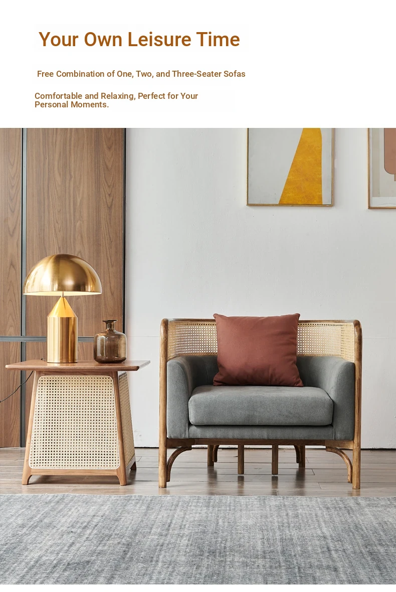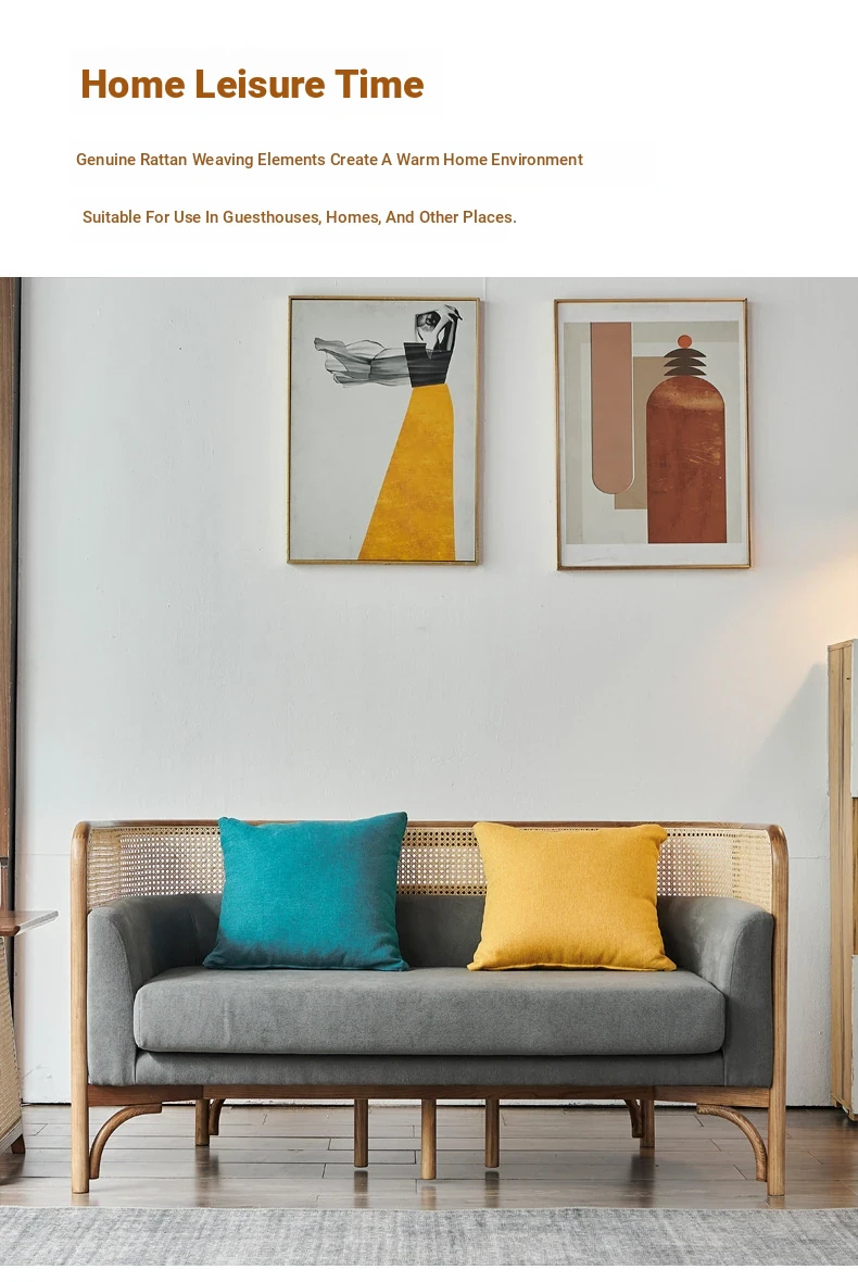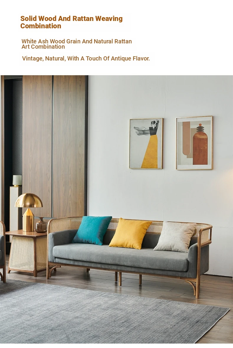 Vintage Rattan Sofa Set - Wabi-Sabi Nordic Style Solid Wood Upholstered Sofa for Hotels and Guesthouses, Featuring Ash Wood Craftsmanship