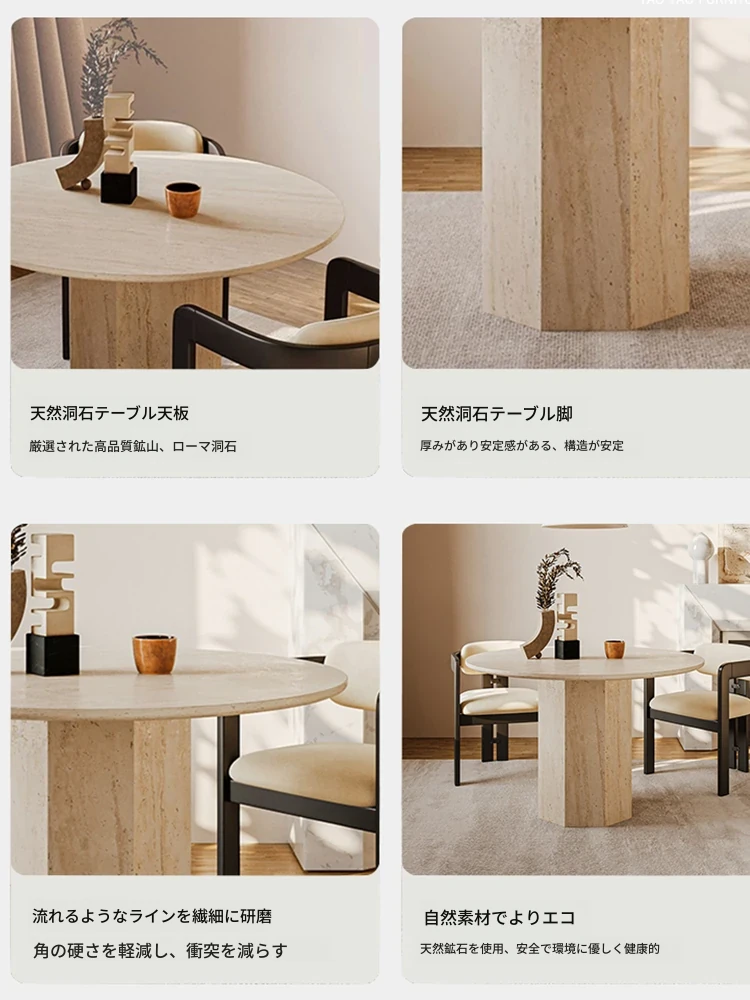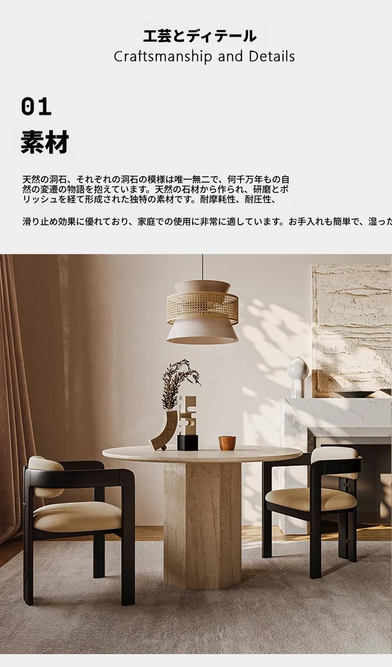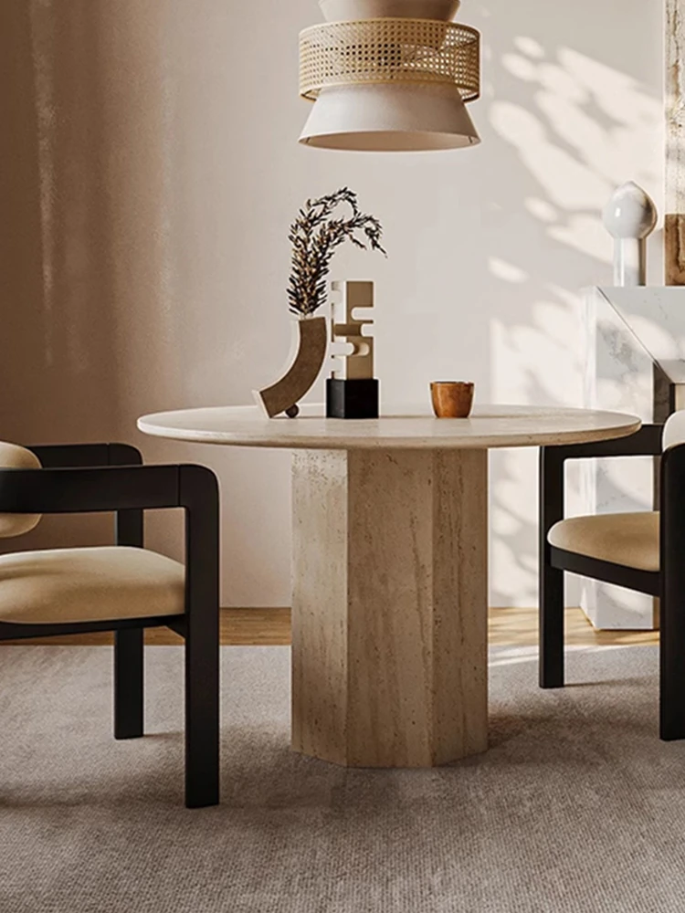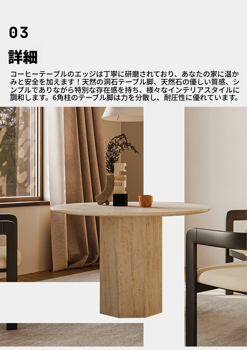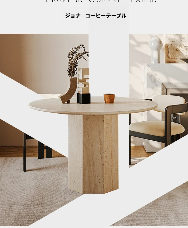 侘寂風の天然洞石を使用した高級丸テーブル - ラグジュアリーな大理石製で、居心地の良いリビングにぴったりの中世風デザイン。おもてなしにも最適な上質な一品!