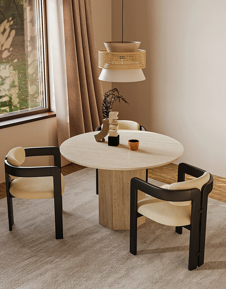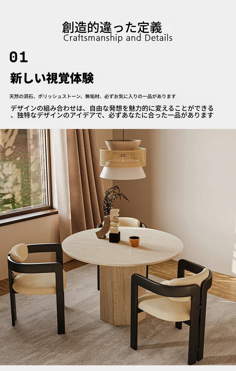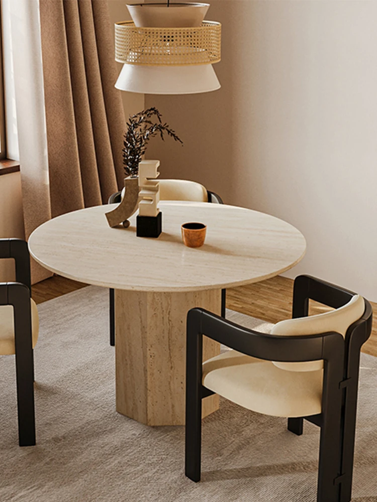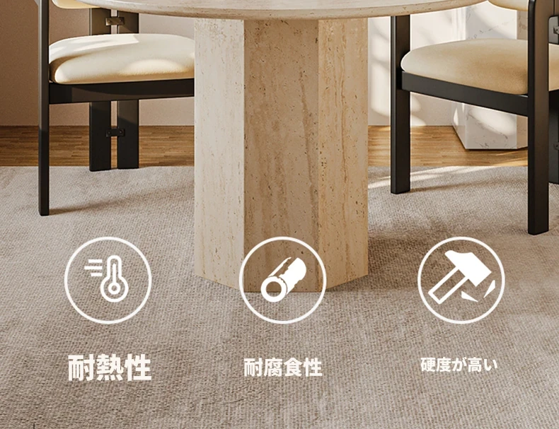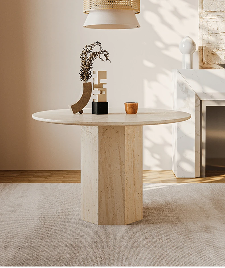 侘寂風の天然洞石を使用した高級丸テーブル - ラグジュアリーな大理石製で、居心地の良いリビングにぴったりの中世風デザイン。おもてなしにも最適な上質な一品!